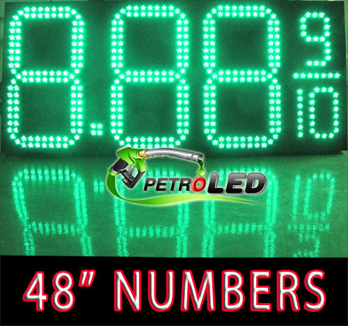 48 inch Green Digits LED Digital Gas Price sign - 48" Character Height for Truck stop Plaza locations - Configuration:8.88 9/10 - Controller, Power supply & brightness sensor built into the sign. Takes 110V power, 2 RF Remote controls, up to 300 feet (1 remote control is an extra backup remote, in case there is ever a problem) - 140° Viewing Angle - The size of the sign is: - 110"(L) x 53" (H) x 4" (W). Auto brightness control built into the sign. Built with Super high brightness, LED traffic light LED chips for long term brightness and dependability. Heavy Duty commercial steel housing, made for tall and high wind locations. LED life expectancy is 100,000 hours.