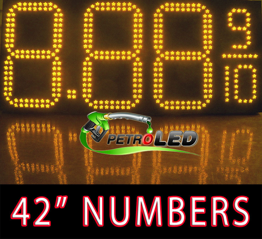 42 inch Amber (Yellow) Digits LED Digital Gas Price sign - 42" Character Height for Truck stop Plaza locations - Configuration:8.88 9/10 - Controller, Power supply & brightness sensor built into the sign. Takes 110V power, 2 RF Remote controls, up to 300 feet (1 remote control is an extra backup remote, in case there is ever a problem) - 140° Viewing Angle - The size of the sign is: - 103"(L) x 46" (H) x 4" (W). Auto brightness control built into the sign. Built with Super high brightness, LED traffic light LED chips for long term brightness and dependability. Heavy Duty commercial steel housing, made for tall and high wind locations. LED life expectancy is 100,000 hours.
