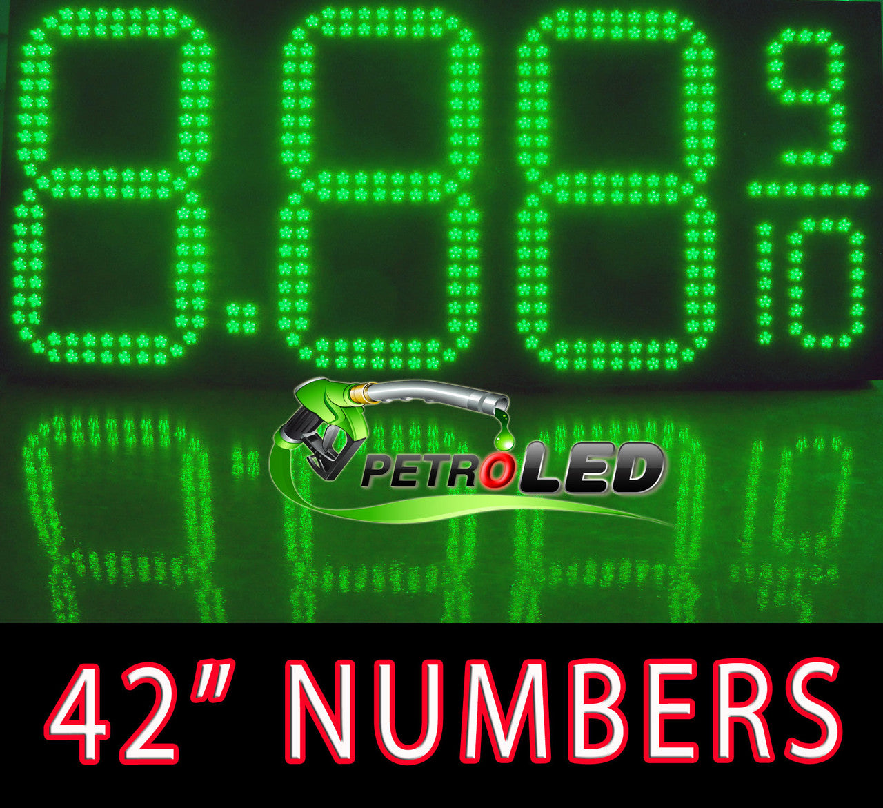42 inch Green Digits LED Digital Gas Price sign - 42" Character Height for Truck stop Plaza locations - Configuration:8.88 9/10 - Controller, Power supply & brightness sensor built into the sign. Takes 110V power, 2 RF Remote controls, up to 300 feet (1 remote control is an extra backup remote, in case there is ever a problem) - 140° Viewing Angle - The size of the sign is: - 103"(L) x 46" (H) x 4" (W). Auto brightness control built into the sign. Built with Super high brightness, LED traffic light LED chips for long term brightness and dependability. Heavy Duty commercial steel housing, made for tall and high wind locations. LED life expectancy is 100,000 hours.