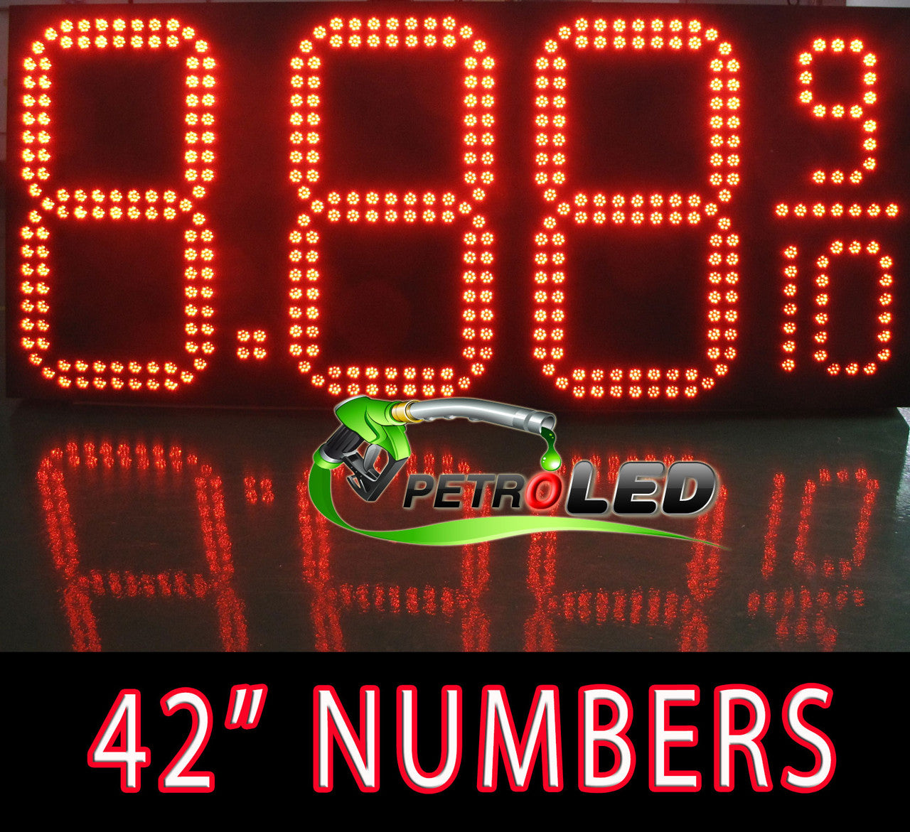 42 inch Red Digits LED Digital Gas Price sign - 42" Character Height for Truck stop Plaza locations - Configuration:8.88 9/10 - Controller, Power supply & brightness sensor built into the sign. Takes 110V power, 2 RF Remote controls, up to 300 feet (1 remote control is an extra backup remote, in case there is ever a problem) - 140° Viewing Angle - The size of the sign is: - 103"(L) x 46" (H) x 4" (W). Auto brightness control built into the sign. Built with Super high brightness, LED traffic light LED chips for long term brightness and dependability. Heavy Duty commercial steel housing, made for tall and high wind locations. LED life expectancy is 100,000 hours.